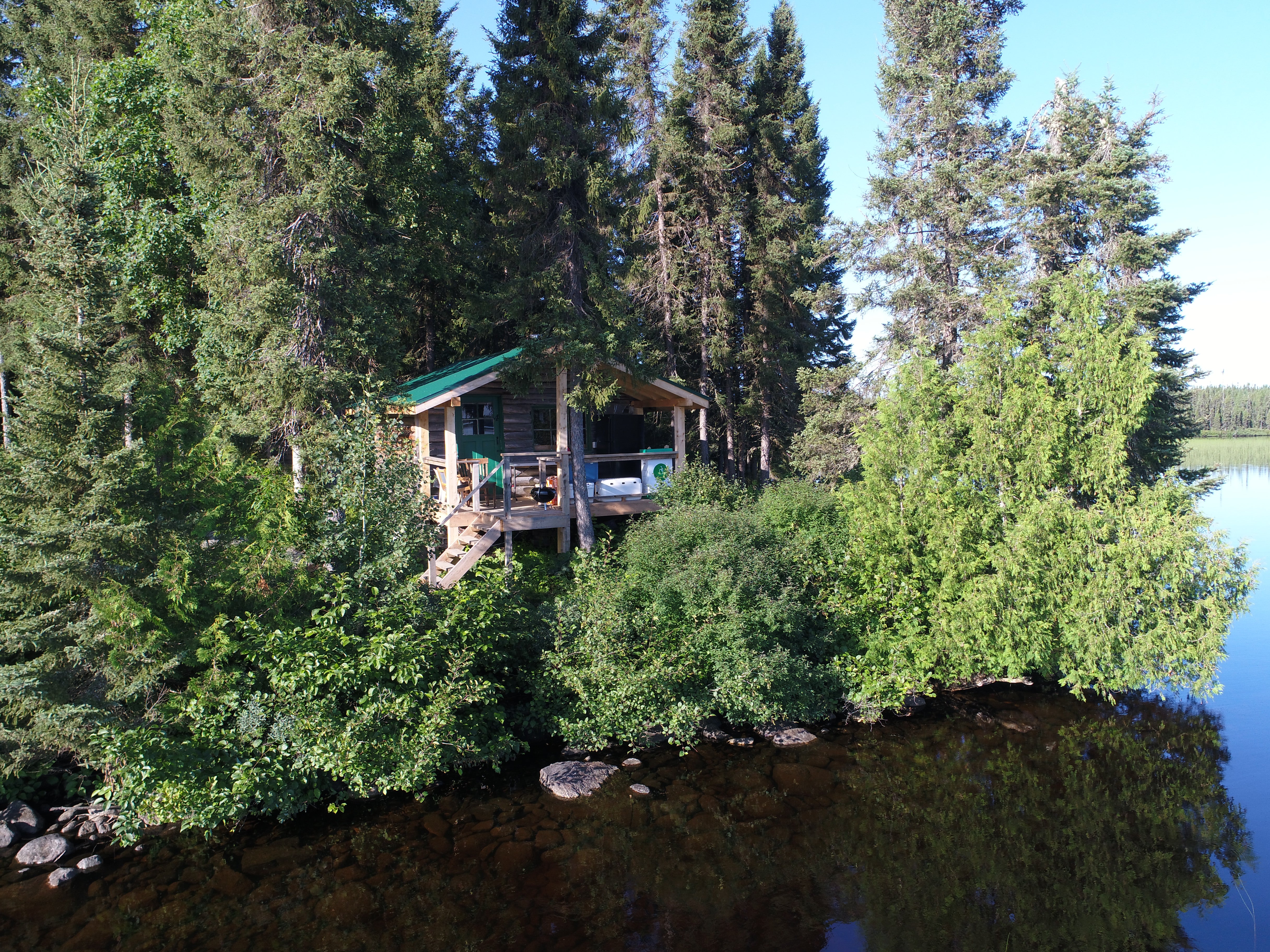 Rustic log cabins directly on waterfront with equipped kitchen.